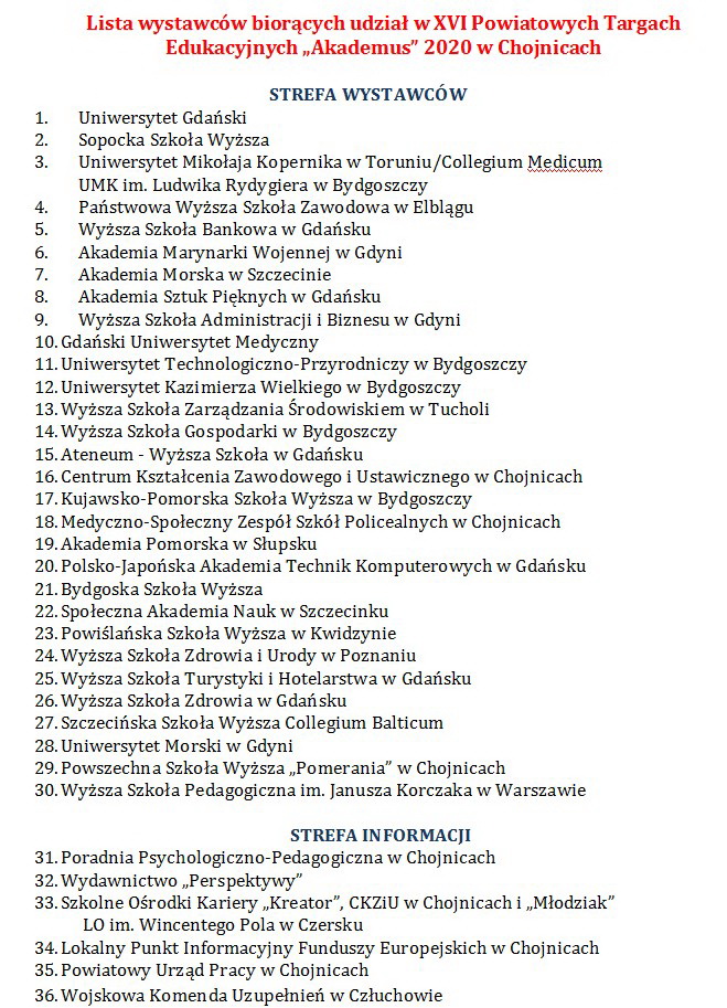 Przedstawiciele Lokalnego Puntu Informacyjnego Funduszy Europejskich w Chojnicach, a także specjaliści wojskowi z WKU w Człuchowie, którzy mają wiedzę m.in. na temat rekrutacji na studia wojskowe. Organizatorzy cały czas dbają o to, aby targi spełniały jak najlepiej funkcję wspierania młodych ludzi w procesie podejmowania decyzji o wyborze dalszej ścieżki edukacyjno-zawodowej.
