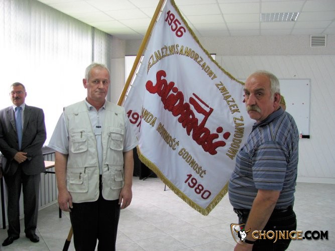 Związkowi działacze na tle sztandaru