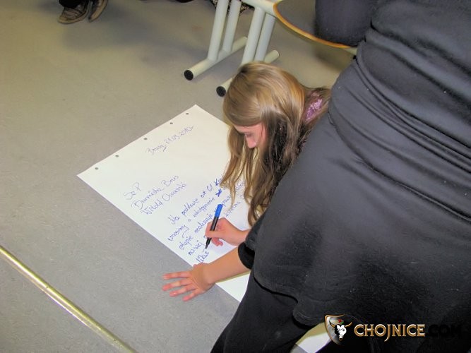 grupa młodzieży z Zespołu Szkół Ponadgimnazjalnych w Brusach kończy pisać list do swojego burmistrza