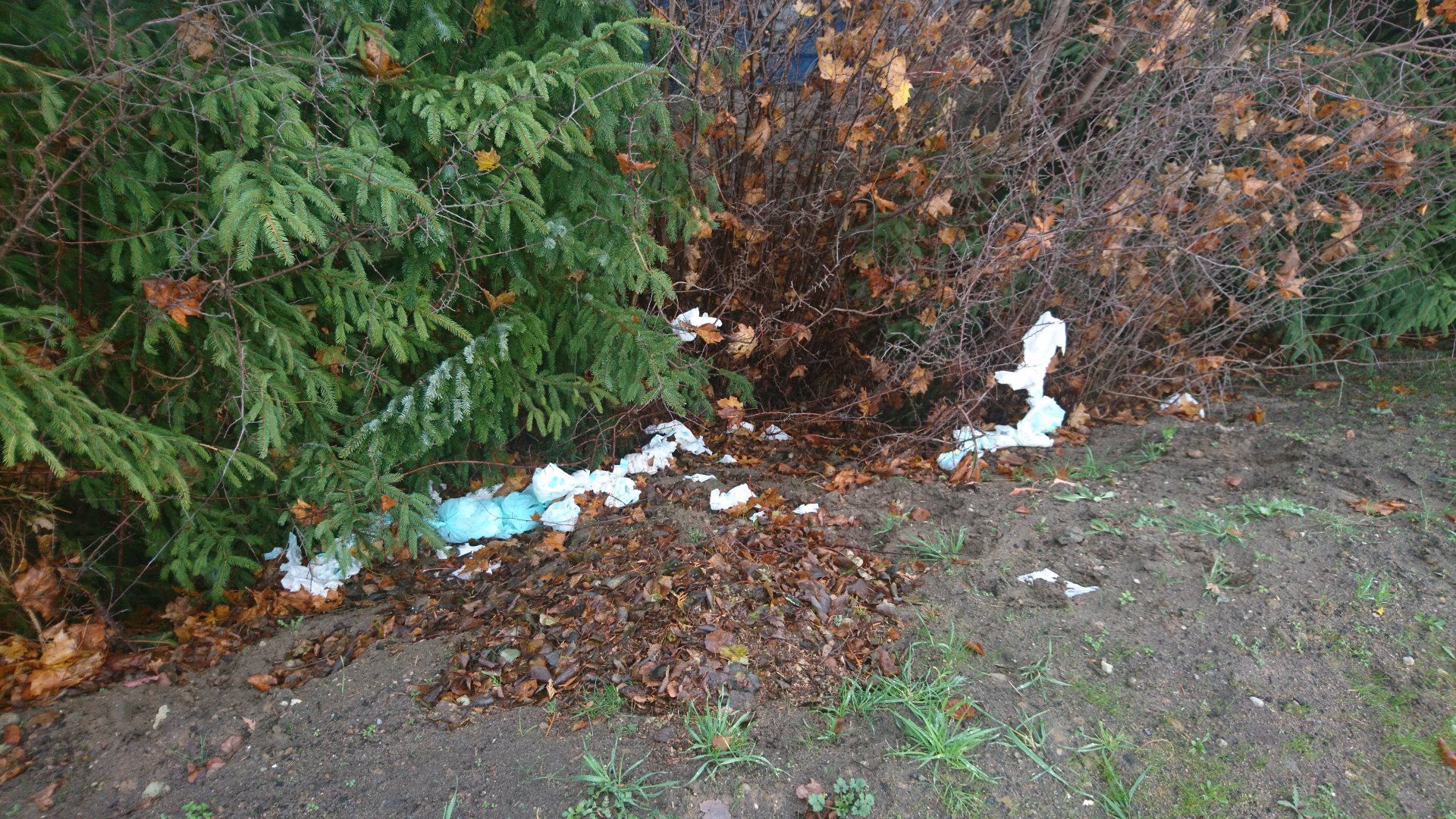 Zużyte pampersy obok parkingu przy cmentarzu w Charzykowach. Nagroda za wskazanie sprawcy!