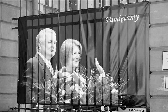 Zdjęcia pary prezydenckiej na pałacowym ogrodzeniu.