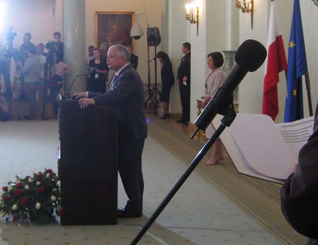 Przemawia Prezydent Lech Kaczyński. W głębi Maria Kaczyńska.