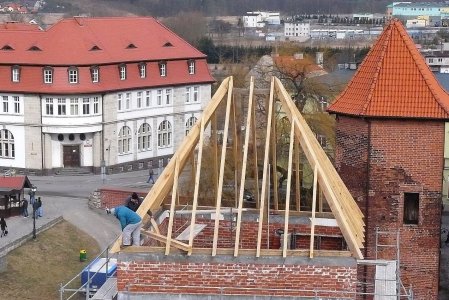 Łagodniejsza aura pozwoliła pracownikom firmy Kaparis wrócić na plac budowy baszty w fosie miejskiej. - Do końca przyszłego tygodnia zamierzamy dokończyć montaż i deskowanie więźby dachowej – zapewnia Dariusz Rząska, właściciel Kaparisu.