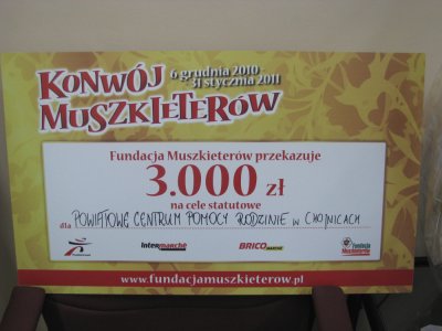 Powiatowe Centrum Pomocy Rodzinie otrzymało od „Konwoju Muszkieterów” czek na 3000 złotych. Zostały za te pieniądze zakupione paczki dla zawodowych rodzin zastępczych, które są podopiecznymi PCPR.