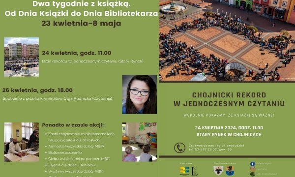 Bicie chojnickiego rekordu w jednoczesnym czytaniu, Spotkanie z pisarką Olgą Rudnicką, Znani chojniczanie za biblioteczną ladą, Giełda książek i Amnestia czytelnicza – to propozycje tegorocznej edycji akcji Dwa tygodnie z książką.