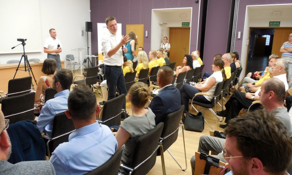Ostatnim punktem programu pobytu w Chojnicach lidera ruchu Polska 2050 Szymona Hołowni było spotkanie w sali konferencyjnej CE-W z sympatykami z Chojnic i województwa pomorskiego. Powitał gościa lider ruchu w powiecie chojnickim Mariusz Paluch.