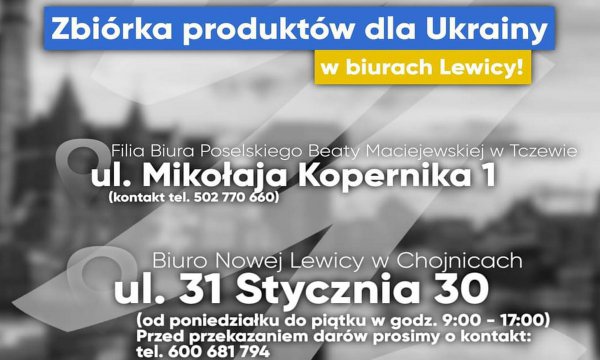 Nowa Lewica Chojnice również włącza się w akcję pomocy obywatelom Ukrainy. Szanowni mieszkańcy powiatu chojnickiego, Nowa Lewica Chojnice dołącza do akcji zbierania niezbędnych produktów dla obywatelek i obywateli walczącej Ukrainy.