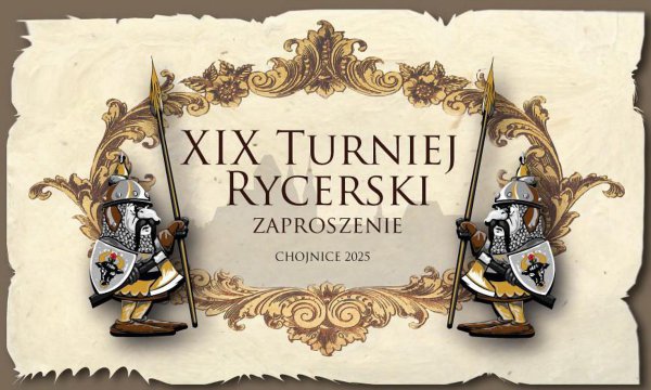 Bractwo Rycerskie herbu TUR i Chojnickie Centrum Kultury zapraszają serdecznie na XIX Turniej Rycerski, który odbędzie się dnia 30 sierpnia Roku Pańskiego 2025 na placu turniejowym w Chojnickim Parku 1000-lecia.