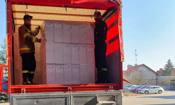Do Komendy Powiatowej Państwowej Straży Pożarnej w Chojnicach dotarł transport 377 000 sztuk maseczek ochronnych (zdjęcia poniżej). W dniu 11.03.2021 maseczki zostaną rozdysponowane na poszczególne gminy powiatu chojnickiego.