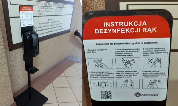 W budynku Starostwa Powiatowego w Chojnicach stanęły dozowniki ze środkiem do dezynfekcji. Do zasady mycia rąk warto stosować się nie tylko podczas używania płynu antybakteryjnego.