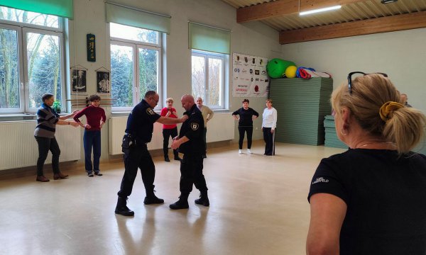 Na sali gimnastycznej Ośrodka Profilaktyki Rodzinnej w Chojnicach przeprowadzony został drugi blok zajęć w ramach „Akademii Na Straży Seniorów – Edycja II”. Instruktorzy Straży Miejskiej realizowali z uczestnikami Akademii zajęcia z samoobrony.