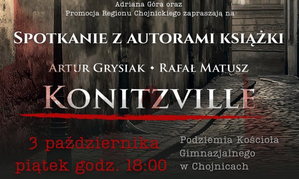 Zapraszamy mieszkańców Chojnic i okolic na wyjątkowe spotkanie z autorami książki Konitzville - Arturem Grysiakiem i Rafałem Mateuszem, które odbędzie się 3 października o godzinie 18:00 w podziemiach Kościoła Gimnazjalnego.