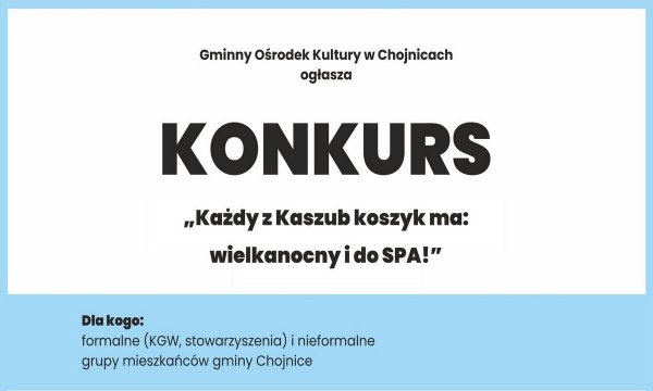 Gminny Ośrodek Kultury w Chojnicach zaprasza formalne (KGW, stowarzyszenia) i nieformalne grupy mieszkańców gminy Chojnice do udziału w konkursie "Każdy z Kaszub koszyk ma: Wielkanocny i do…SPA".