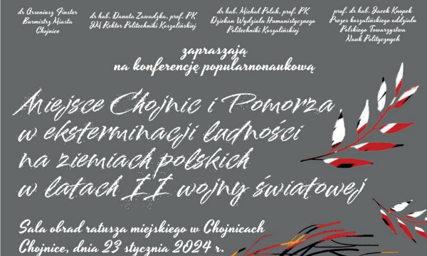 Zapraszamy na konferencję popularnonaukową „Miejsce Chojnic i Pomorza w eksterminacji ludności na ziemiach polskich w latach II wojny światowej”, która odbędzie się 23 stycznia 2024 r. o godz. 11:00 w Ratuszu sali obrad.
