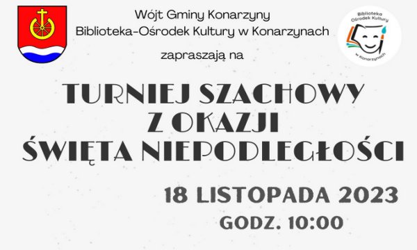 Wójt Gminy Konarzyny Jacek Warsiński oraz Biblioteka-Ośrodek Kultury w Konarzynach zapraszają na Otwarty Turniej Szachowy z okazji Narodowego Święta Niepodległości.