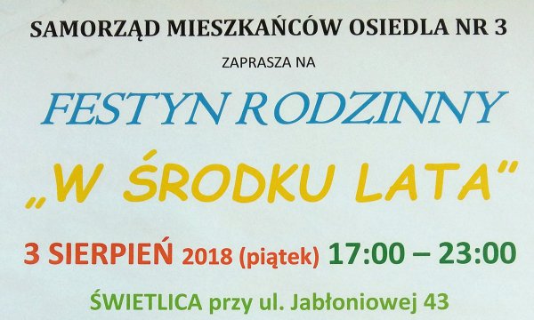 Samorząd Mieszkańców nr 3 zaprasza w piątek na festyn rodzinny „W środku lata”. Dla siebie znajdą coś i młodsi, i nieco starci. Początek o 17.00. Festyn odbędzie się przy świetlicy przy ul. Jabłoniowej.