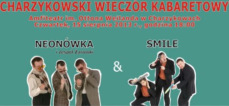 Charzykowski Wieczór Kabaretowy co roku gromadzi tłumy nie tylko chojniczan ale i turystów. W tym roku wystąpią doskonale znane publiczności kabarety: „Neonówka” wraz zespołem „Żarówki” i kabaret „Smile”.