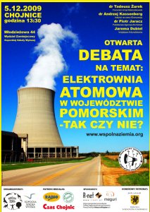 W najbliższą sobotę (5 grudnia) Stowarzyszenie Ekologiczno - Kulturalne "Wspólna Ziemia" wspólnie z Sopocką Szkołą Wyższą organizują w Chojnicach otwartą debatę pod hasłem "Elektrownia atomowa w województwie pomorskim - tak c