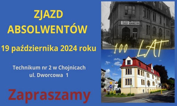Drodzy Absolwenci Technikum nr 2 w Chojnicach, z wielką radością i dumą pragniemy zaprosić Was na wyjątkowe wydarzenie – jubileuszowy zjazd z okazji 100-lecia naszej szkoły.