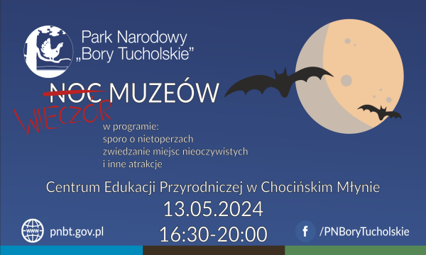 PN „Bory Tucholskie” zaprasza na spotkanie w ramach akcji Noc Muzeów. Wydarzenie będzie miało miejsce 13 maja w Centrum Edukacji Przyrodniczej Parku Narodowego „Bory Tucholskie”, w Chocińskim Młynie (Chociński Młyn 5, 89-608 Swornegacie).