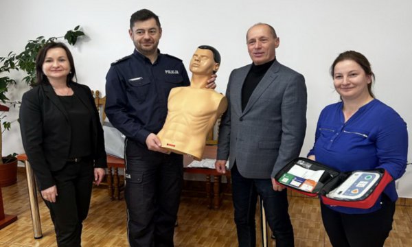 Wójt Gminy Konarzyny Jacek Warsiński oraz Przewodnicząca Gminnej Komisji Rozwiązywania Problemów Alkoholowych i Przeciwdziałania Narkomani Krystyna Rudnik, przekazali na ręce Komendanta KPP w Chojnicach fantom wraz z defibrylatorem AED.