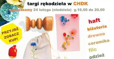 Chojnicki Dom Kultury zaprasza na Targi Rękodzieła Artystycznego, które odbędą się 24 lutego (niedziela) od godziny 16. 00 do 20.00. Zaprezentujemy lokalnych twórców rękodzieła oraz ich prace.