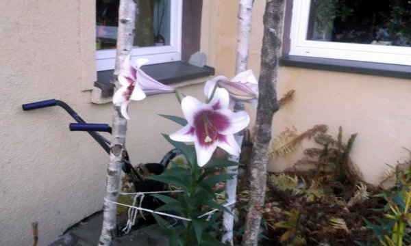 Sołtys Gutowca Zbigniew Krzoska prezentuje lilie, które zakwitły przed jego domem tuż przed obchodami Narodowego Święta Niepodległości.