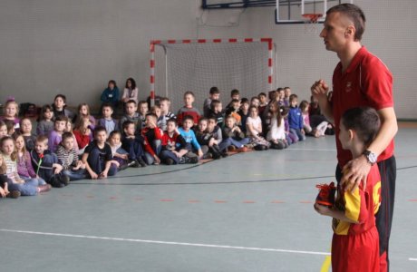 Piłkarze drugoligowej Chojniczanki odwiedzają chojnickie szkoły podstawowe i zachęcają chłopców i dziewczęta do gry w piłkę w klubie. Świetnie w rolę prowadzącego wcielił się Tomasz Parzy.