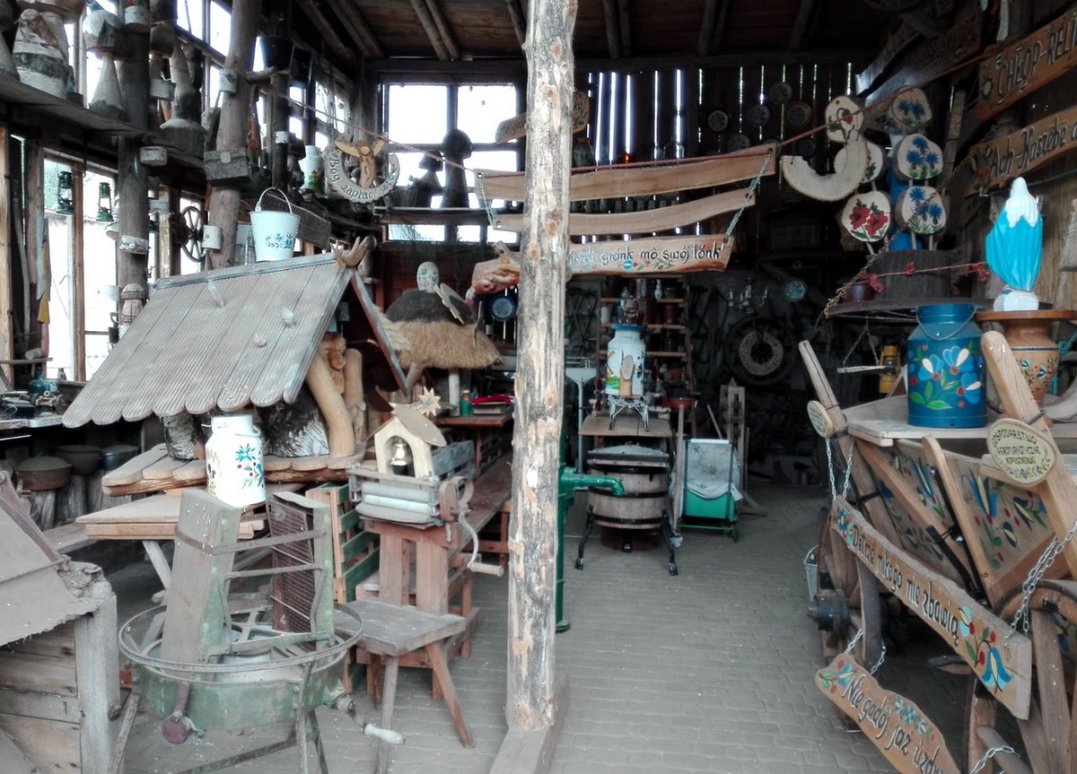 Ciekawostką jest m.in. pierwsza drewniana, ponad 100 letnia pralka „automatyczna” napędzana siłą mięśni użytkownika, urządzenia do oddzielenia tłuszczu od mleka, młynki do kawy itp. Można tam również obejrzeć stare lampy (w tym kolejowe ), stare powozy i bryczki, zapomniane już dawno radioodbiorniki, telewizory, bańki do mleka i tysiące różnych staroci. Na terenie całego gospodarstwa widoczne są informacje i napisy świadczące o korzeniach właściciela i jego żony. Wszystkim odwiedzającym towarzyszą olbrzymie ilości wzorów, napisów kaszubskich i rzezb.