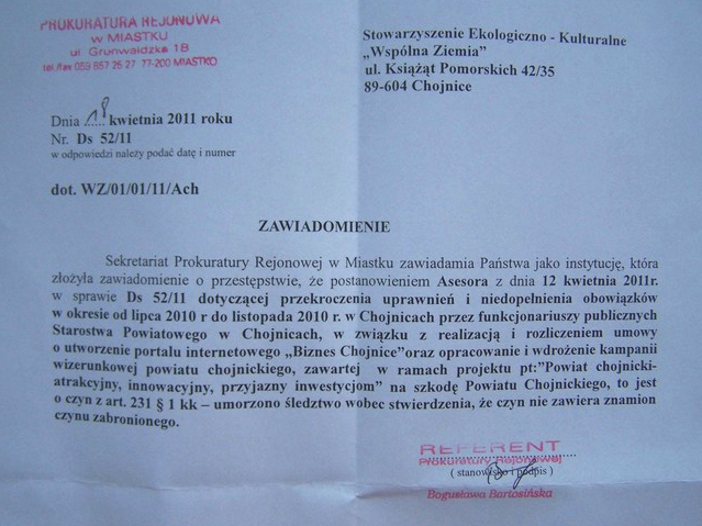 Stowarzyszenie „Wspólna Ziemia” w styczniu 2011 wysłało do Prokuratury Okręgowej w Słupsku zawiadomienie o podejrzeniu popełnienia przestępstwa przez pracowników Starostwa Powiatowego w Chojnicach.