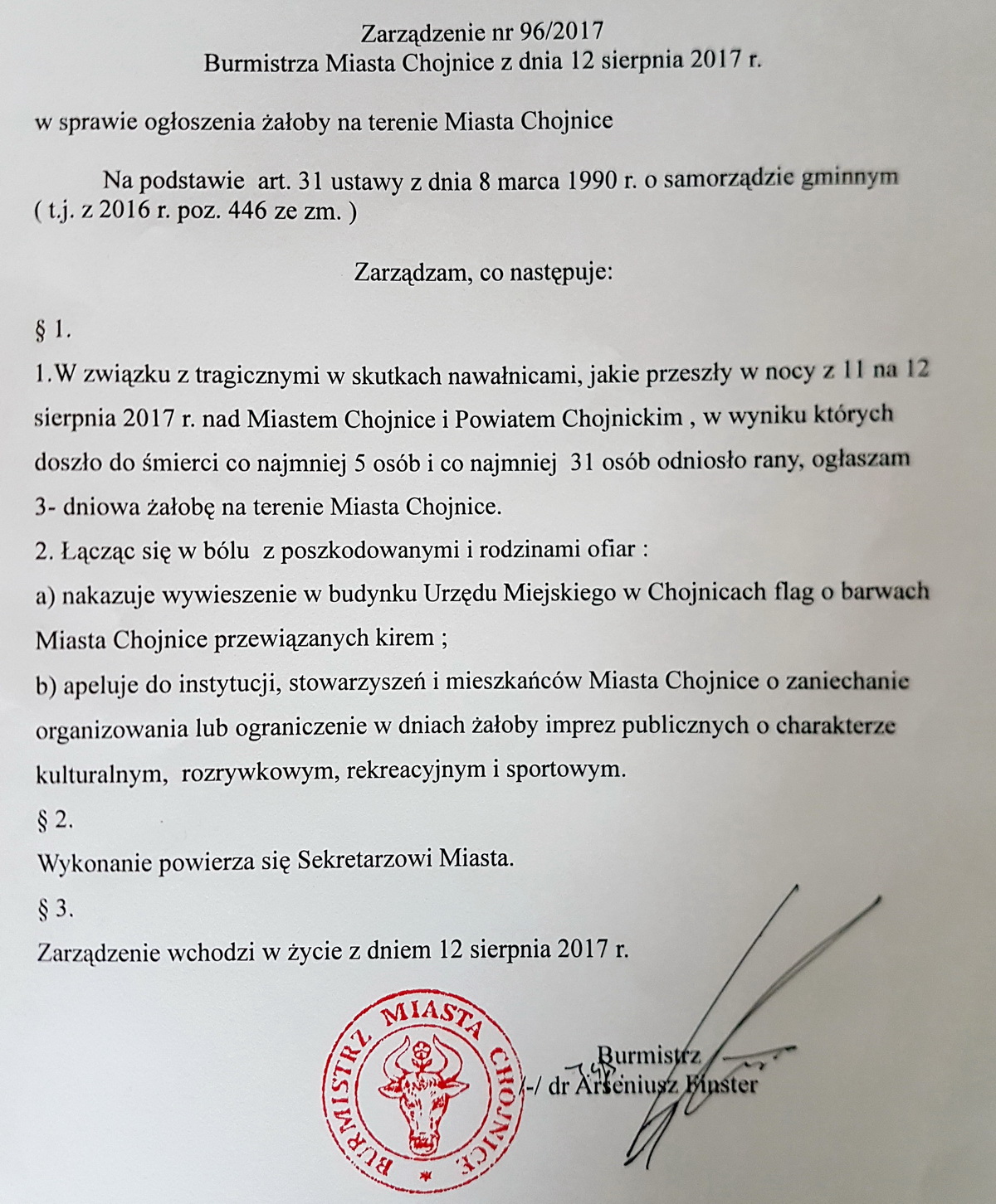 Burmistrz miasta Chojnice i wójt Gminy Chojnice w związku z tragicznymi wydarzeniami, będącymi konsekwencją nocnej nawałnicy, gdzie śmierć w powiecie chojnickim poniosło pięć osób, podjęli decyzję o odwołaniu imprez kulturalnych.