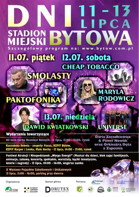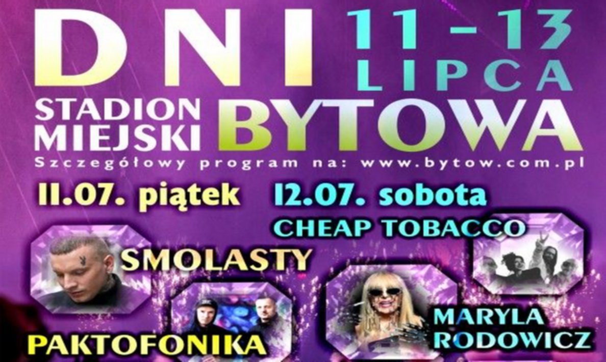 Program Dni Bytowa został podzielony na cały weekend. Koncerty gwiazd odbywają się na Stadionie Miejskim przy ul. Mickiewicza 13. W piątek od 18.00 wystąpi m.in. nasz chojnicki RooMX oraz Paktofonika i Smolasty. W sobotę również od 18.00 m.in. uczestnicy zajęć w Bytowskim Centrum Kultury, Julia Bronk oraz Maryla Rodowicz. Natomiast w niedzielę 13.07 o 17.00 zostanie zaprezentowane przedstawienie teatralne dla dzieci „Na ratunek przyrodzie”. Od 19.00 będzie okazja posłuchać coverów Krzysztofa Krawczyka, a potem będzie koncert zespołu Universe. Może wybiorą się na niego ci, dla których zabrakło miejsca w chojnickiej Fosie Miejskiej, gdy ten zespół wystąpił na Dniach Chojnic 2024? Od 21.30 na bytowskim stadionie koncert Dawida Kwiatkowskiego.