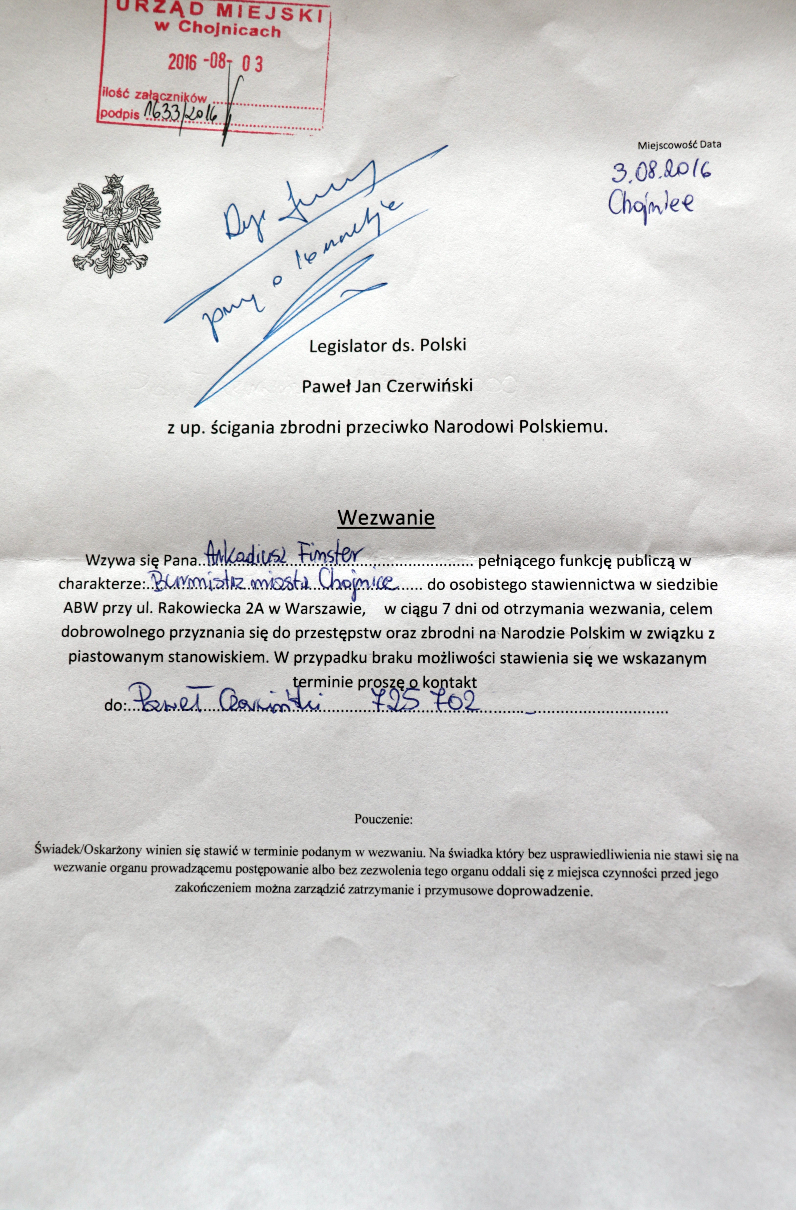 - Po raz pierwszy doznaliśmy szoku w urzędzie. Sytuację opisałem prokuratorowi w zawiadomieniu o podejrzeniu popełnienia przestępstwa - relacjonuje burmistrz Finster. W czym rzecz? 3 sierpnia o godz. 14 wspomniani panowie weszli do sekretariatu burmistrza i wręczyli pismo do złudzenia przypominające oryginalny dokument (zobacz) sygnowany przez „Legislatora ds. Polski Pawła Jana Czerwińskiego z up. ścigania zbrodni przeciwko Narodowi Polskiemu”.