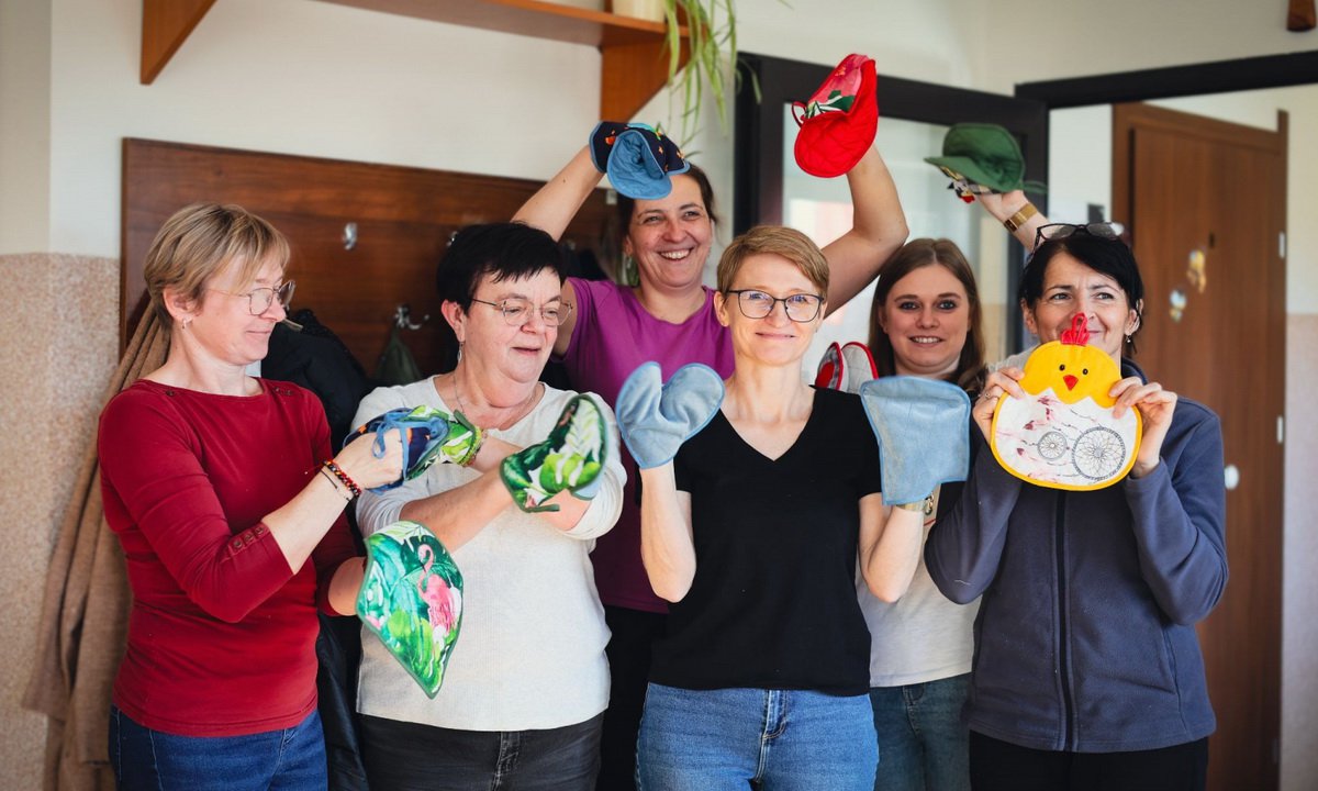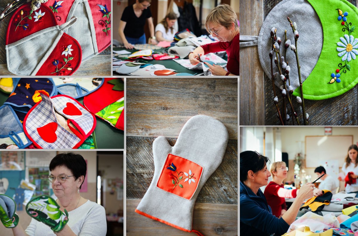 Wszystkie te ręcznie wykonane przedmioty – przede wszystkim łapki kuchenne, ale też palmy wielkanocne, ozdoby i słodkości – będzie można kupić podczas kilku wydarzeń charytatywnych. | fot. Aleksandra Ciniewska
