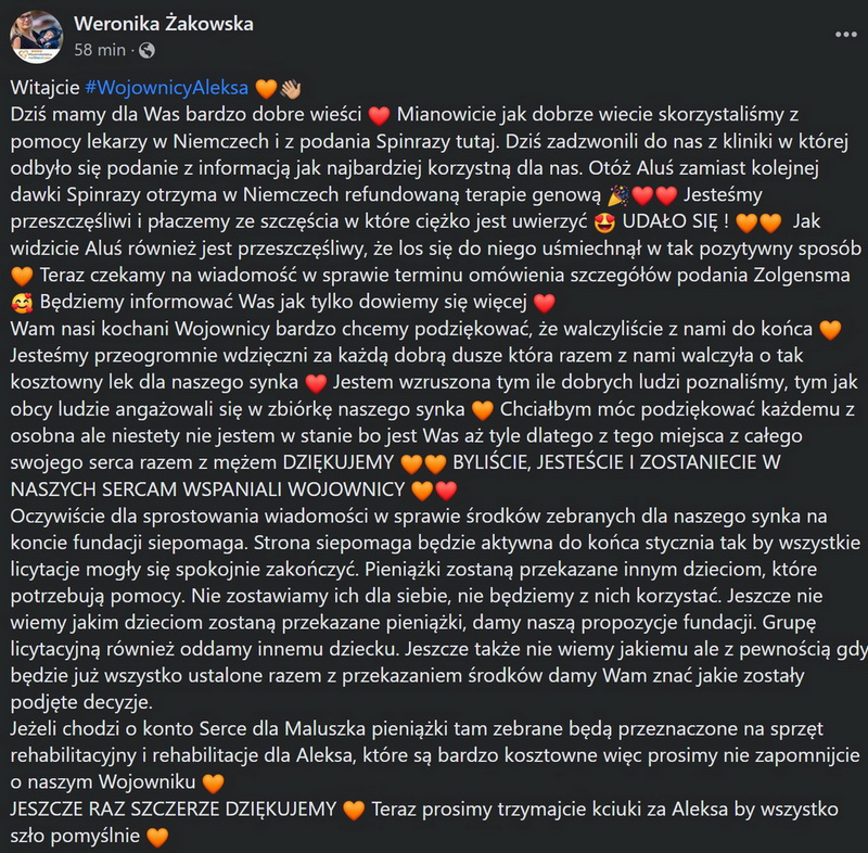 O szczęśliwym finale niesienia pomocy dla chorego chłopca poinformowała na facebooku mama chłopca.