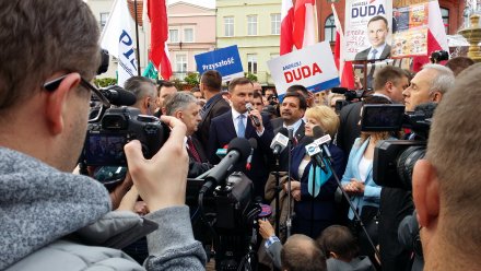 15 maja 2015 19:19Aktualizacja. Z półgodzinnym opóźnieniem pojawił się w Chojnicach kandydat na Prezydenta RP – Andrzej Duda. Spotkał się z mieszkańcami miasta. Na koniec kilkuminutowej wizyty podziękował za liczne przybycie i poprosił o mobilizację w drugiej turze głosowania.