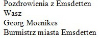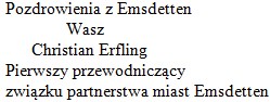 Również Wasz burmistrz, Arseniusz Finster, będzie zachęcał w Emsdetten do uczestnictwa w wyborach do Parlamentu Europejskiego, z czego się bardzo cieszymy.