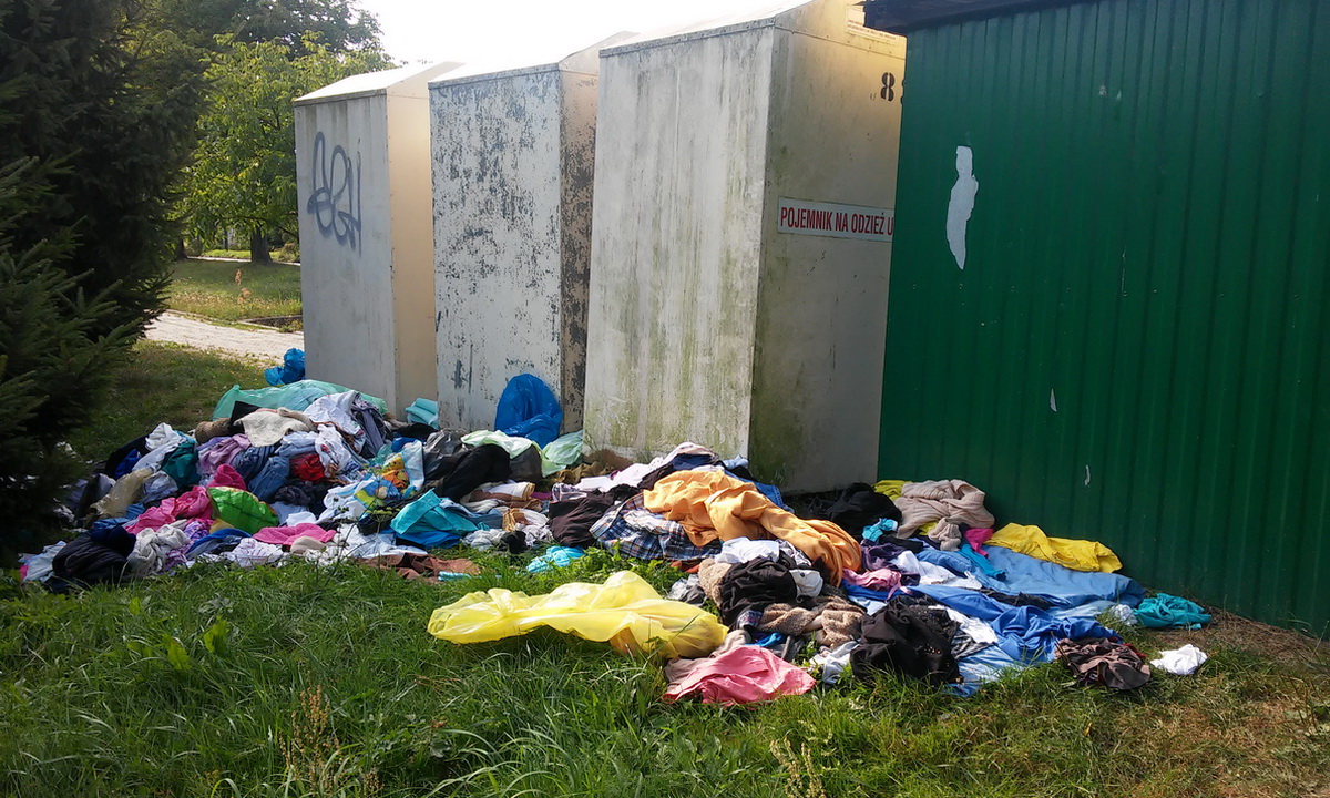 Takie oto wątpliwej urody widoki czekają na tych, którzy przechodzą lub przejeżdżają Osiedlem Kolejarz. Przy ulicy Czynu Zbrojnego Kolejarzy przy kontenerach PCK rozrzucone worki z rzeczami i butami.
