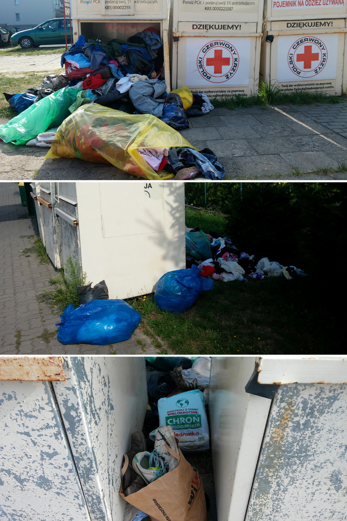 Burmistrz powinien nakazac zlikwidowania tych pojemnikow. A PCK i Caritas zarzadzac zbiorke 4 razy w roku i odbierac z wyznaczonych miejsc. Miasto, szkoly i zaklady pracy przeprowadzic kampanie co do dbania o otoczenie. Ten bałagan i te nieesteyczne, czesto nie dzialajace kontenery, powaznie obnizaja jakosc mieszkania i otoczenia, dbania o przestrzen wspolna i miejska.