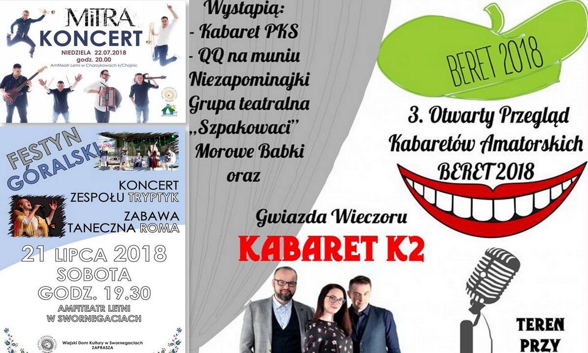 W sobotę w amfiteatrze w Swornegaciach odbędzie się festyn góralski – zagra zespół Tryptyk a po nim zabawa taneczna z zespołem Roma. Start o 19.30. W niedzielę w amfiteatrze w Charzykowach występ zespołu Mitra – początek o godz. 20.00.