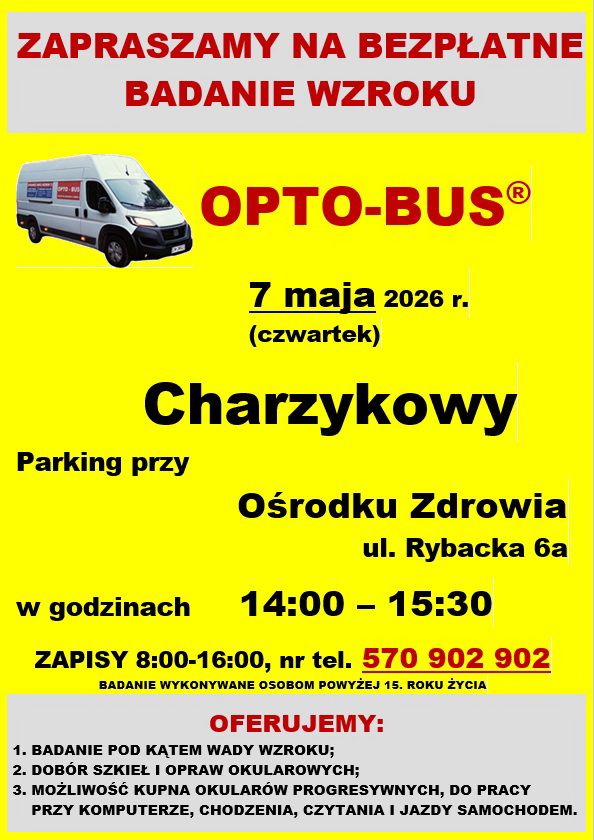 Akcja OPTO-BUS oferuje bezpłatne, komputerowe badania wzroku wykonywane przez przeszkolony personel w mobilnych gabinetach. Badania są bezpieczne, bezbolesne i nie wymagają rozszerzania źrenic. Mobilny punkt pojawi się także w maju Charzykowach.