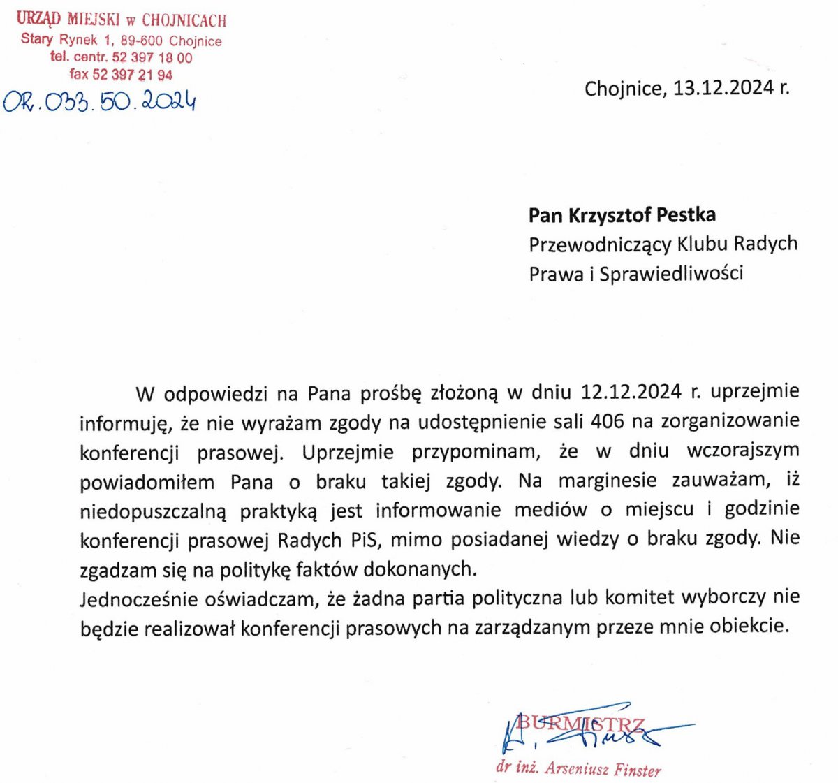 W nawiązaniu do pojawiających się informacji dotyczących planowanej konferencji prasowej radnych Klubu PiS, mającej odbyć się w dniu 13 grudnia o godzinie 12:00 w budynku Ratusza Miejskiego w Chojnicach.