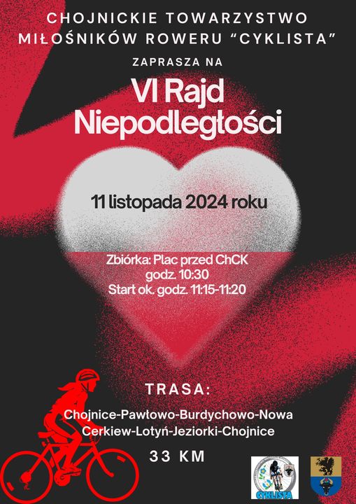 Chojnickie Towarzystwo Miłośników Roweru "Cyklista" przy wsparciu finansowym Starostwa Powiatowego w Chojnicach organizuje VI Rajd Niepodległości. Rajd odbędzie się w dniu 11 listopada. Zbiórka od godz. 10:30 na placu przed ChCK.