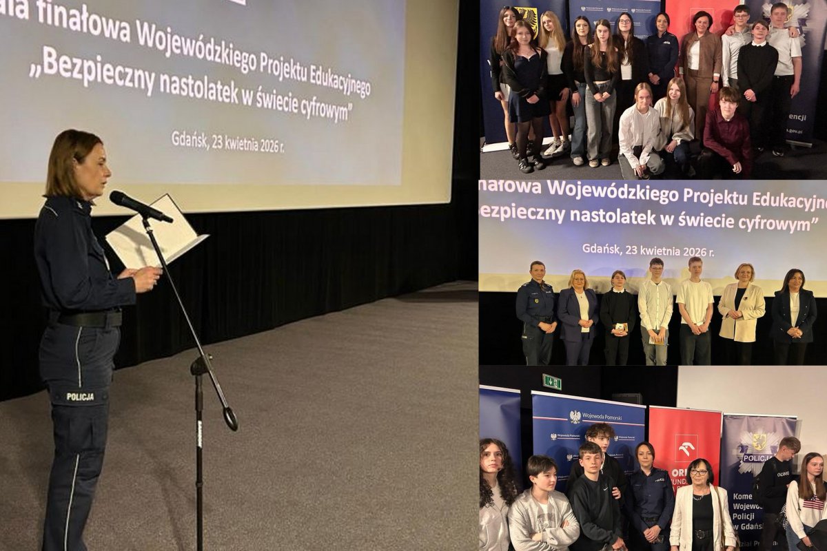 Projekt skierowany był do uczniów klas ósmych szkół podstawowych z województwa pomorskiego. Miał na celu zwiększenie świadomości na temat cyberzagrożeń, takich jak hejt, phishing czy uzależnienie od sieci. | fot. KPP