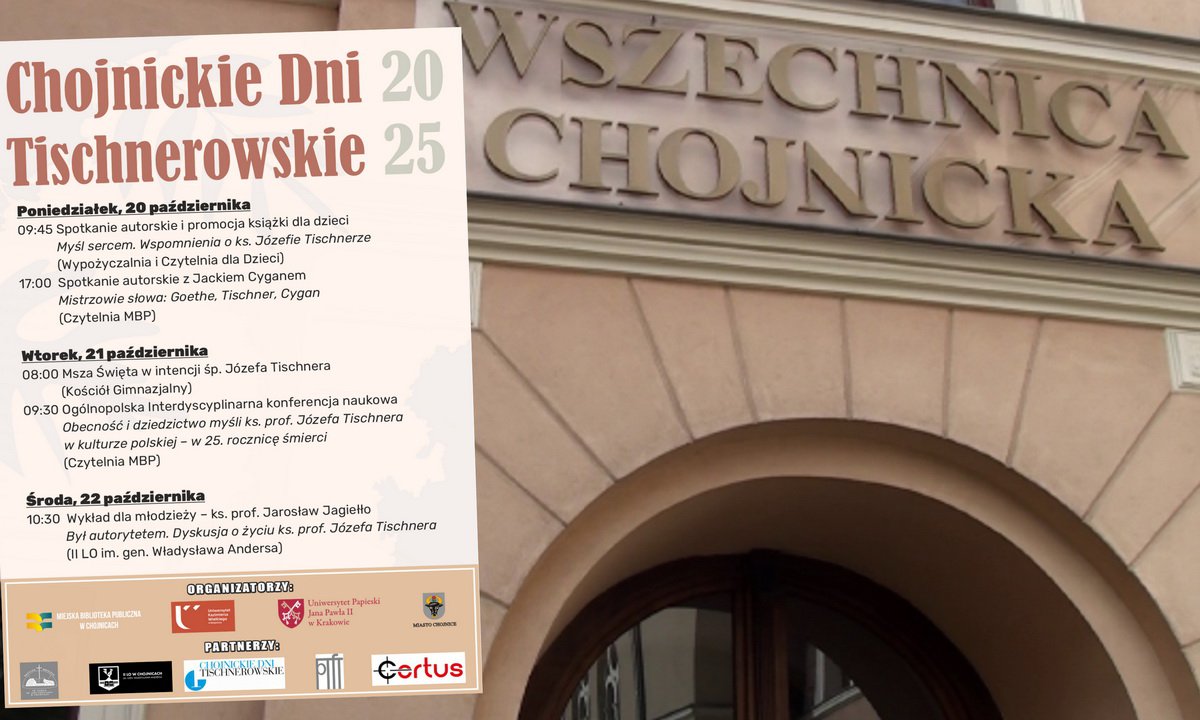 MBP, Uniwersytet Kazimierza Wielkiego w Bydgoszczy, Uniwersytet Papieski Jana Pawła II w Krakowie oraz Miasto Chojnice zapraszają na Chojnickie Dni Tischnerowskie 2025, które trwać będą od poniedziałku do środy 20–22 października br.