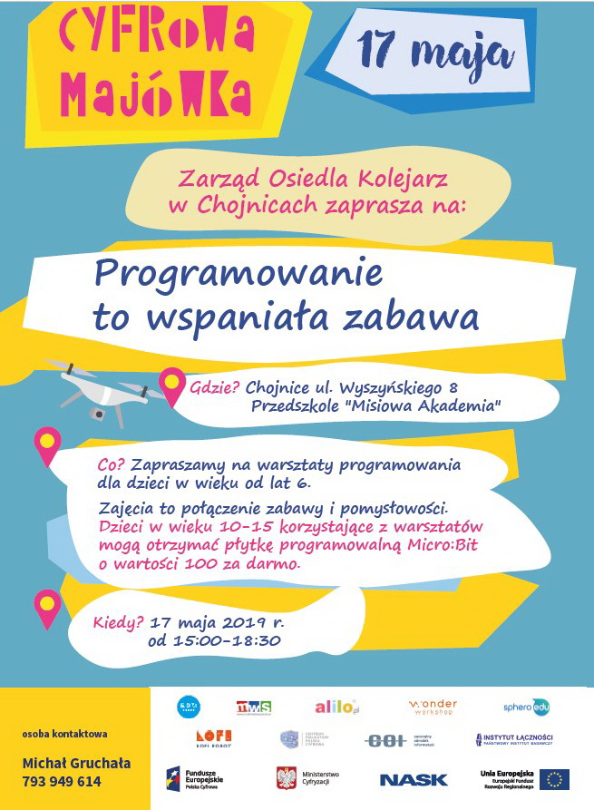 Zarząd Osiedla Kolejarz Prochowa zaprasza dzieci wraz z rodzicami na warsztaty podstaw programowania w ramach ogólnopolskiego programu Ministerstwa Cyfryzacji- Cyfrowa Majówka.