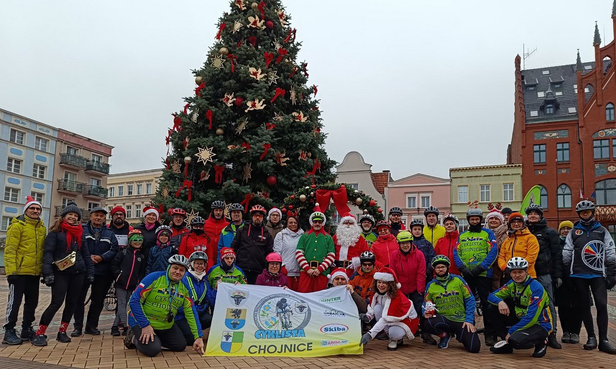 Następnie wróciliśmy do Chojnic. Na mecie podziękowaliśmy sobie za sezon rowerowy AD 2024, który oficjalnie rajdem mikołajkowym został zakończony. Były też świąteczne życzenia i zaproszenia na przyszłoroczne rajdy rowerowe. Po oficjalnym zakończeniu Rajdu część cyklistów razem z Panią Mikołajową i Świętym Mikołajem przejechało przez Park 1000-lecia oraz ulice w centrum miasta, gdzie po drodze obdarowywaliśmy napotkane dzieci i osoby cukierkiem.