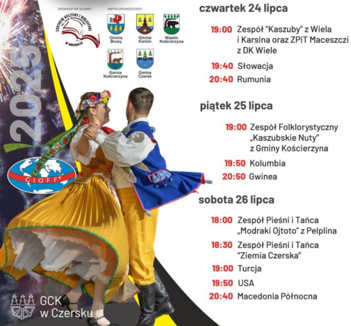 Pokazy grupy tanecznej uświetniają wydarzenia gminne, np. Urodziny Czerska, dożynki, majówkę. Zespół czynnie uczestniczy w Międzynarodowym Festiwalu Folkloru "Kaszubskie Spotkania z Folklorem Świata", gdzie poza Czerskiem występuje również w Wielu i Brusach.” – informuje GCK Czersk. Więcej szczegółów na plakacie. Informacje o zespołach z MFF 2025 na stronie CKiB w Brusach. Pełny program MFF na stronie UM Brusy.