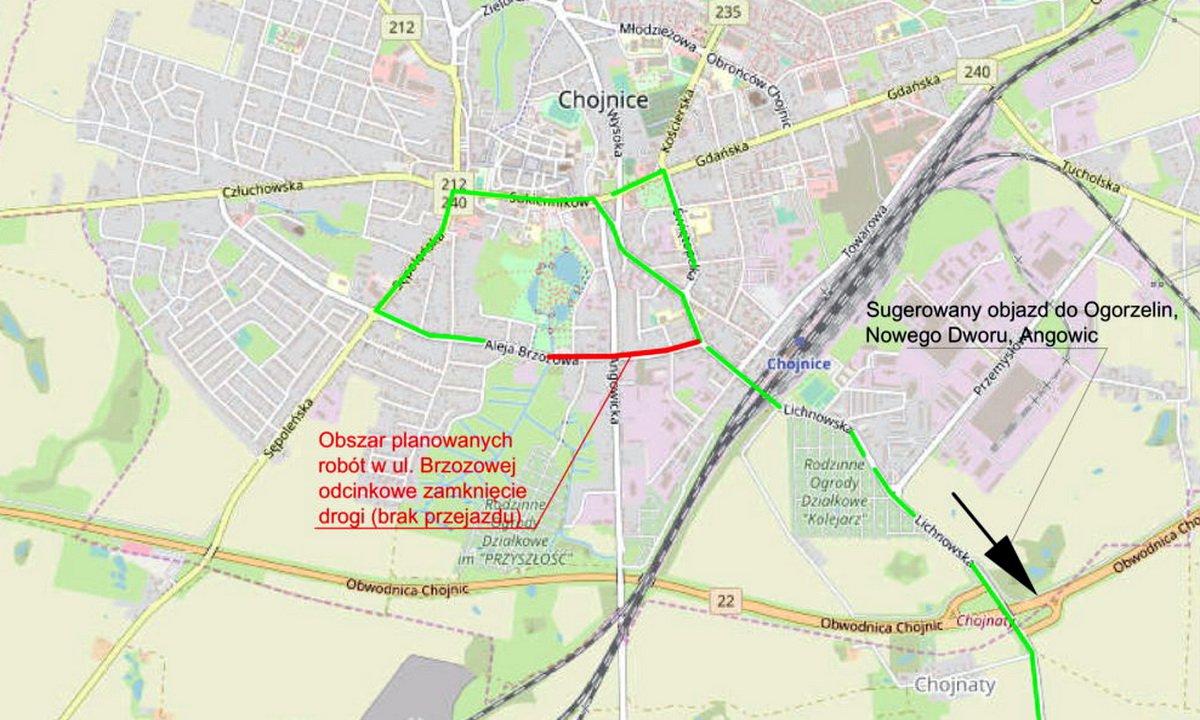 Mapka sugerująca możliwe objazdy części Al. Brzozowej, gdzie trwa remont zamieszczona została na stronie urzędu miasta. | fot. UM Chojnice