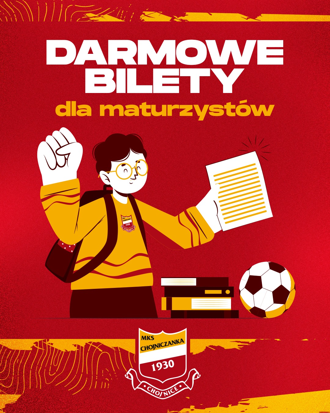 Zapraszamy wszystkich tegorocznych maturzystów do naszej Strefa Kibica Chojniczanki w Domu Towarowym Libera wraz z legitymacją, gdzie otrzymacie darmową wejściówkę! Połamania długopisów i do zobaczenia przy M12 w sobotę!